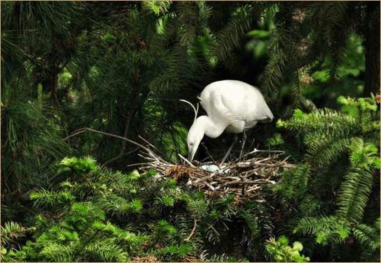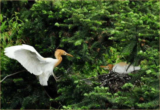 阳山优质的生态环境,吸引了白鹭等以湿地为主要栖息地的鸟类在此筑巢生息。夕阳西下,金色的阳光照耀着白茫茫一片停栖在树梢林间的白鹭,犹如金岸边一道白色的精灵。