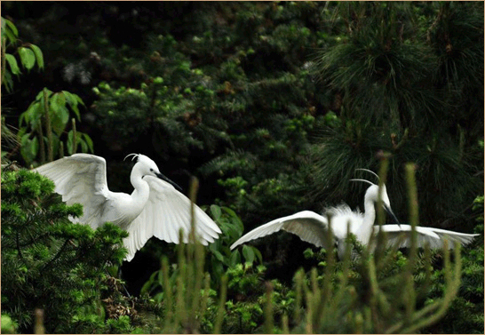 阳山优质的生态环境,吸引了白鹭等以湿地为主要栖息地的鸟类在此筑巢生息。夕阳西下,金色的阳光照耀着白茫茫一片停栖在树梢林间的白鹭,犹如金岸边一道白色的精灵。